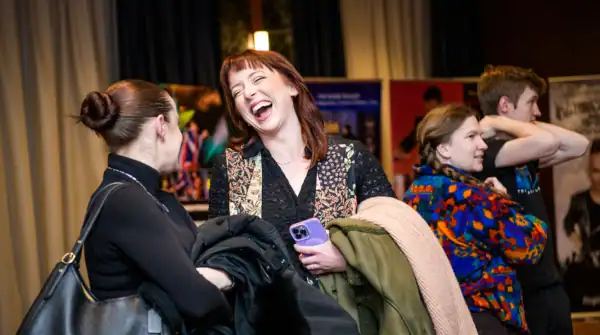 Photo: APAP members smiling after a showcase in the Hilton hallway at APAP|NYC 2025 (Adam Kissick/APAP).